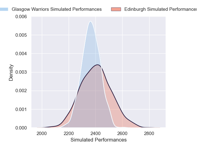 Each club has a rating and a rating deviation (similar to a Glicko rating), and expected performances can be generated. This allows for simulated matches and spreads like the ones below.