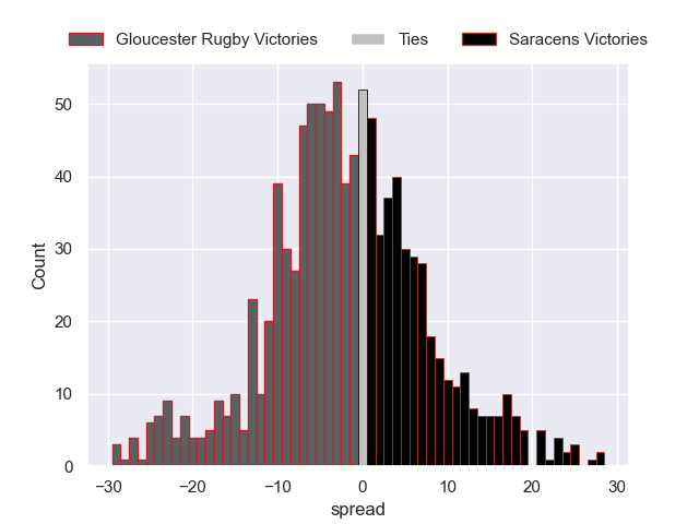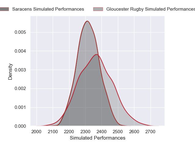 Each club has a rating and a rating deviation (similar to a Glicko rating), and expected performances can be generated. This allows for simulated matches and spreads like the ones below.