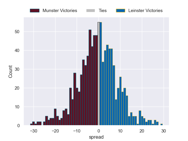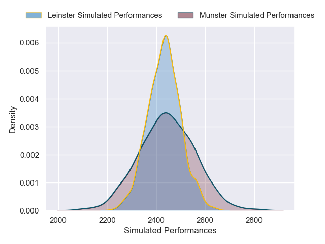 Each club has a rating and a rating deviation (similar to a Glicko rating), and expected performances can be generated. This allows for simulated matches and spreads like the ones below.