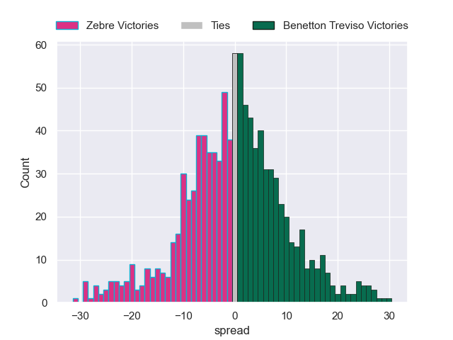 The first set of predictions treats a club as the smallest object, as the club develops its members, organizes a gameplan, and deploys its players as needed for each match. This club model is currently predicting Zebre to win by 0.15.
