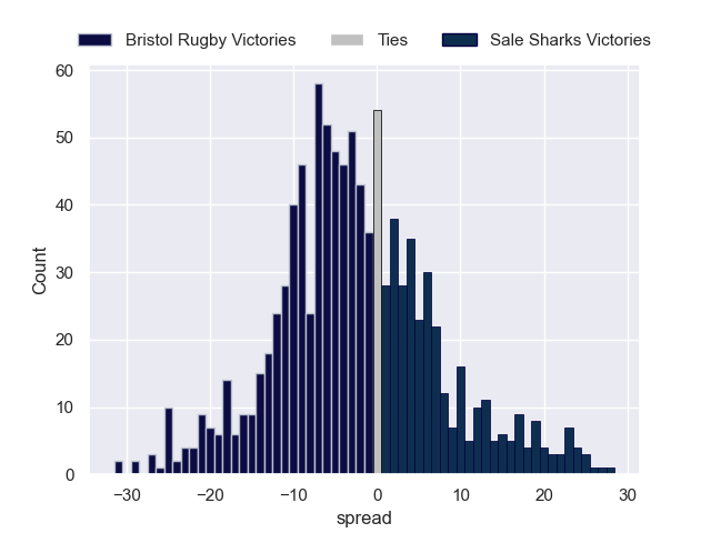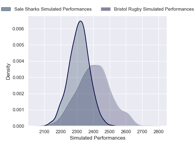 Each club has a rating and a rating deviation (similar to a Glicko rating), and expected performances can be generated. This allows for simulated matches and spreads like the ones below.