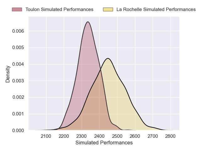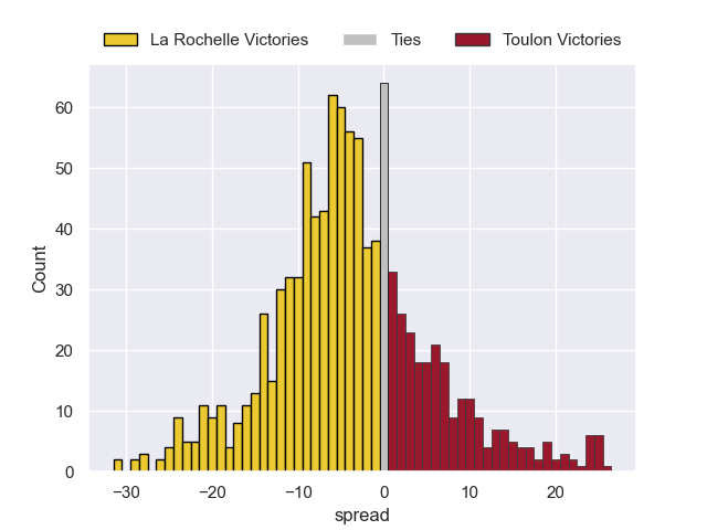 Each club has a rating and a rating deviation (similar to a Glicko rating), and expected performances can be generated. This allows for simulated matches and spreads like the ones below.
