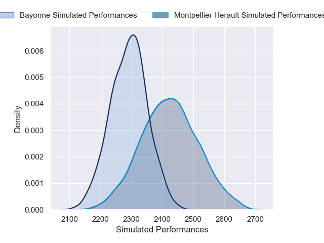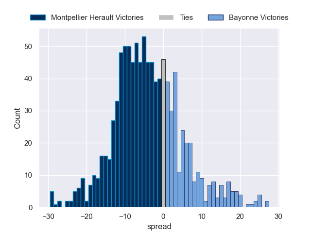 Each club has a rating and a rating deviation (similar to a Glicko rating), and expected performances can be generated. This allows for simulated matches and spreads like the ones below.