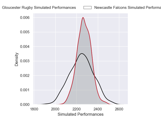 Each club has a rating and a rating deviation (similar to a Glicko rating), and expected performances can be generated. This allows for simulated matches and spreads like the ones below.