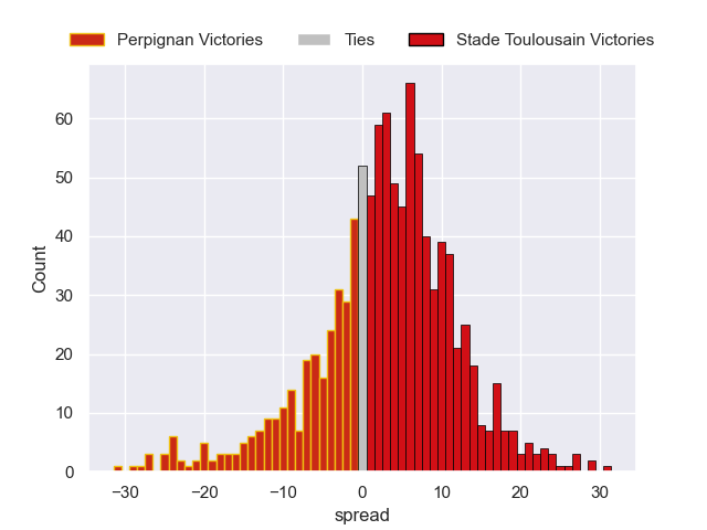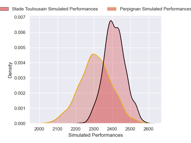 Each club has a rating and a rating deviation (similar to a Glicko rating), and expected performances can be generated. This allows for simulated matches and spreads like the ones below.