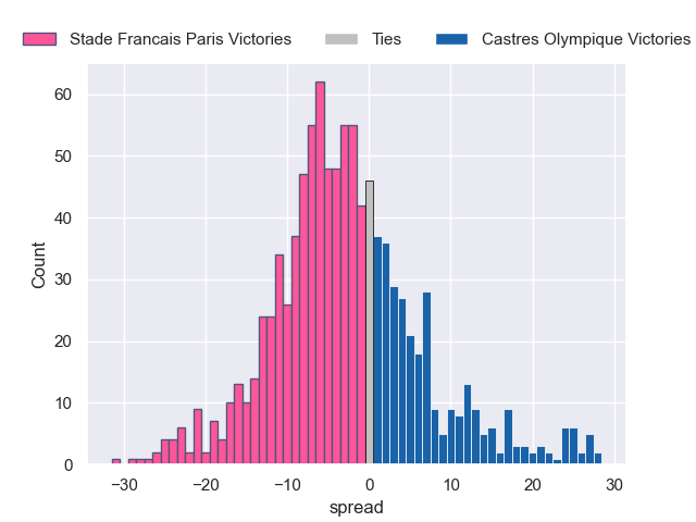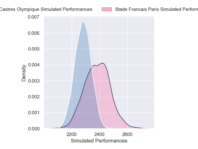 Each club has a rating and a rating deviation (similar to a Glicko rating), and expected performances can be generated. This allows for simulated matches and spreads like the ones below.