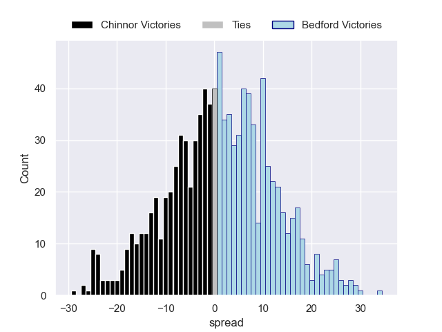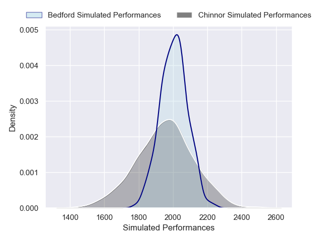 Each club has a rating and a rating deviation (similar to a Glicko rating), and expected performances can be generated. This allows for simulated matches and spreads like the ones below.