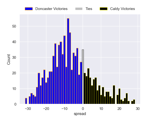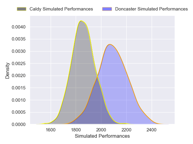 Each club has a rating and a rating deviation (similar to a Glicko rating), and expected performances can be generated. This allows for simulated matches and spreads like the ones below.
