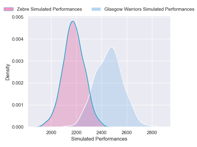Each club has a rating and a rating deviation (similar to a Glicko rating), and expected performances can be generated. This allows for simulated matches and spreads like the ones below.