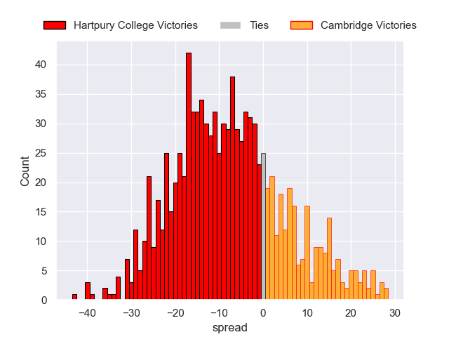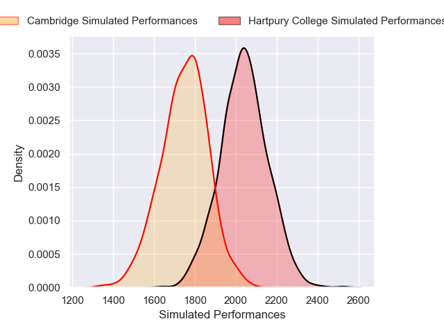 Each club has a rating and a rating deviation (similar to a Glicko rating), and expected performances can be generated. This allows for simulated matches and spreads like the ones below.