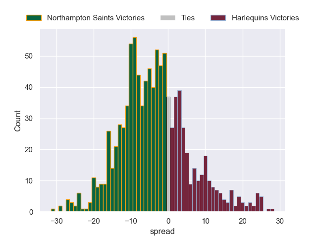 Each club has a rating and a rating deviation (similar to a Glicko rating), and expected performances can be generated. This allows for simulated matches and spreads like the ones below.
