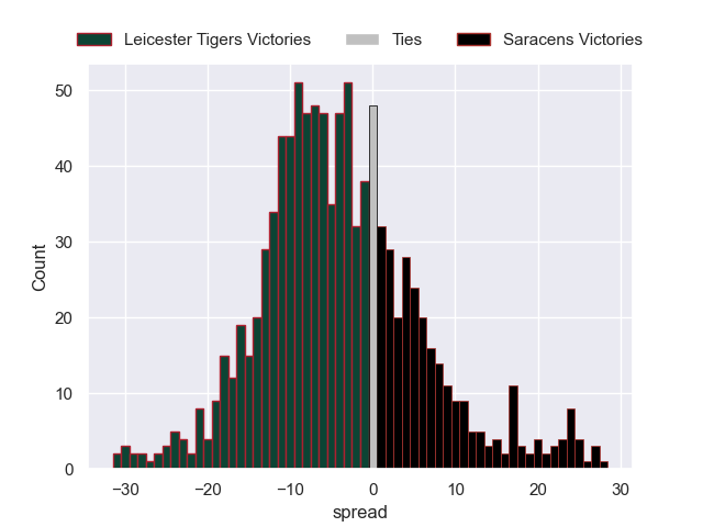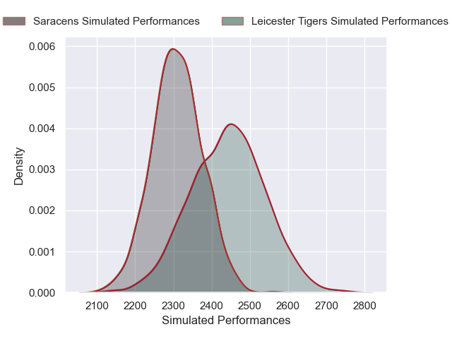 Each club has a rating and a rating deviation (similar to a Glicko rating), and expected performances can be generated. This allows for simulated matches and spreads like the ones below.