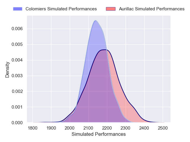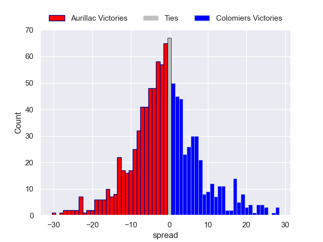 Each club has a rating and a rating deviation (similar to a Glicko rating), and expected performances can be generated. This allows for simulated matches and spreads like the ones below.