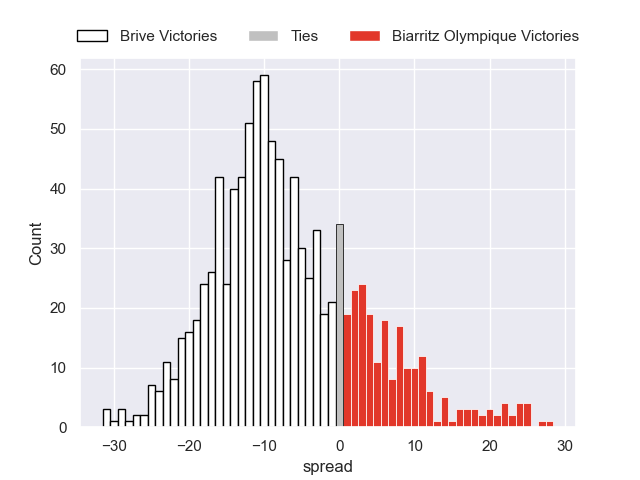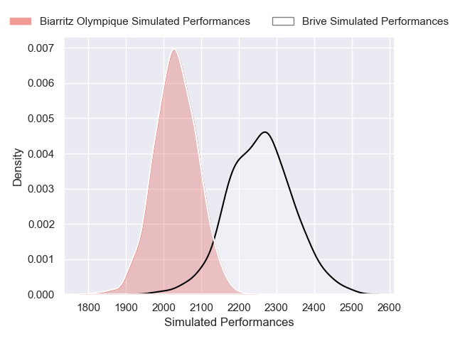 Each club has a rating and a rating deviation (similar to a Glicko rating), and expected performances can be generated. This allows for simulated matches and spreads like the ones below.