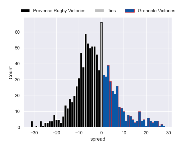 Each club has a rating and a rating deviation (similar to a Glicko rating), and expected performances can be generated. This allows for simulated matches and spreads like the ones below.