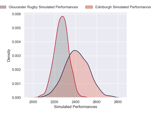 Each club has a rating and a rating deviation (similar to a Glicko rating), and expected performances can be generated. This allows for simulated matches and spreads like the ones below.