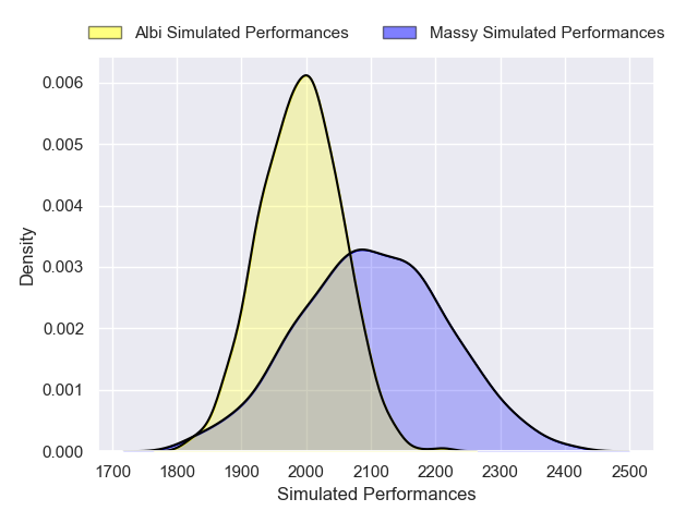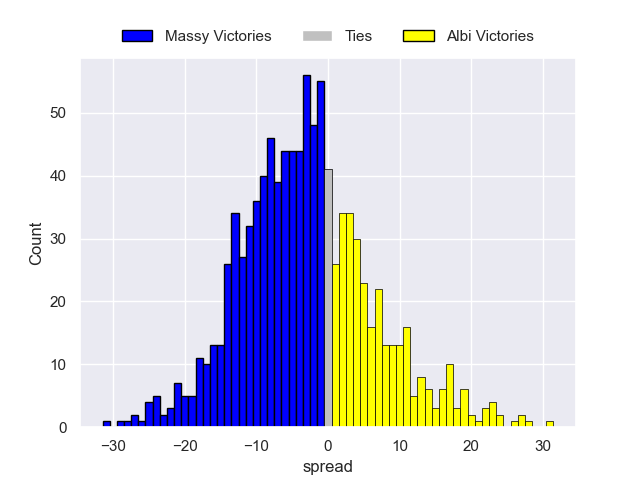 Each club has a rating and a rating deviation (similar to a Glicko rating), and expected performances can be generated. This allows for simulated matches and spreads like the ones below.
