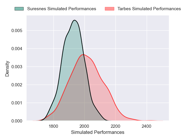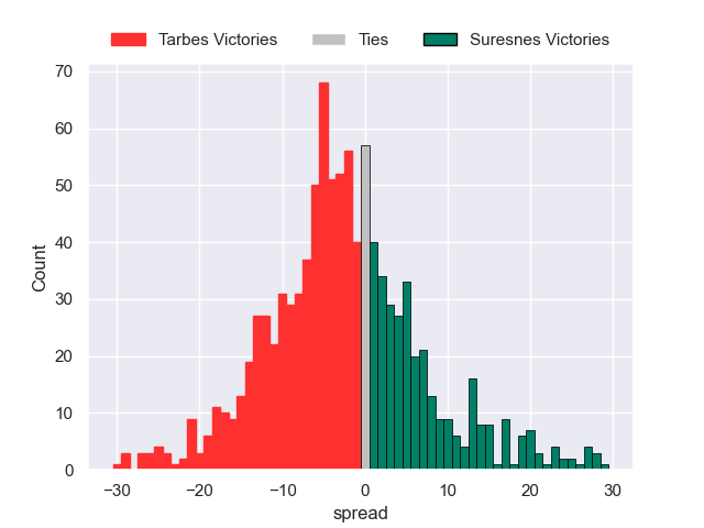 Each club has a rating and a rating deviation (similar to a Glicko rating), and expected performances can be generated. This allows for simulated matches and spreads like the ones below.