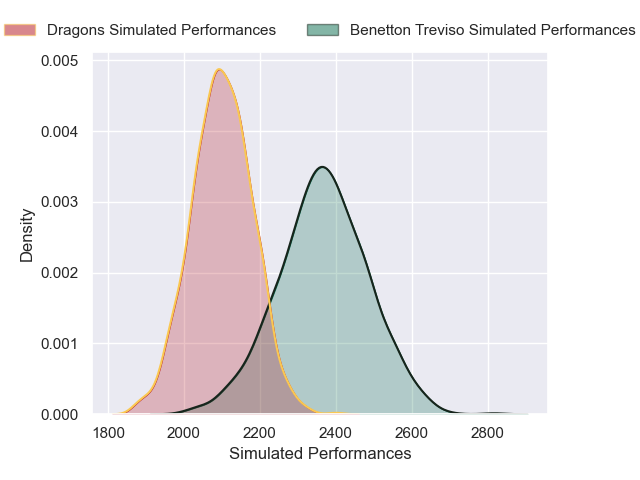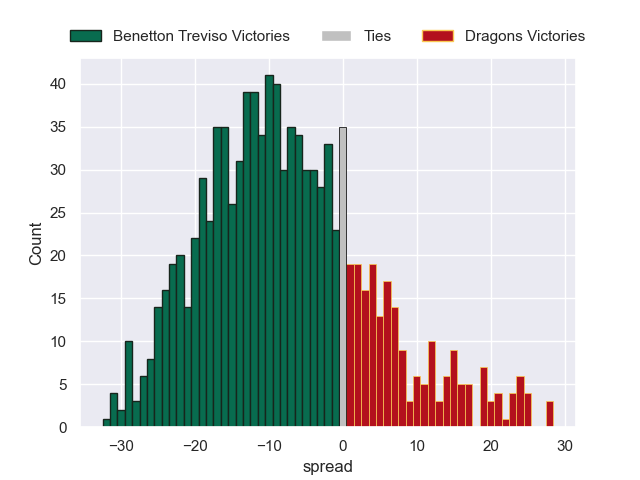 Each club has a rating and a rating deviation (similar to a Glicko rating), and expected performances can be generated. This allows for simulated matches and spreads like the ones below.