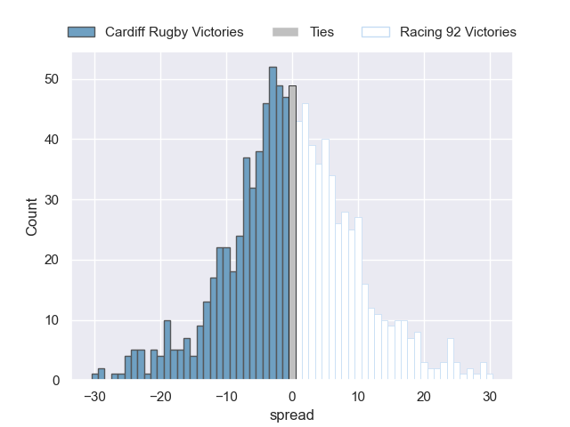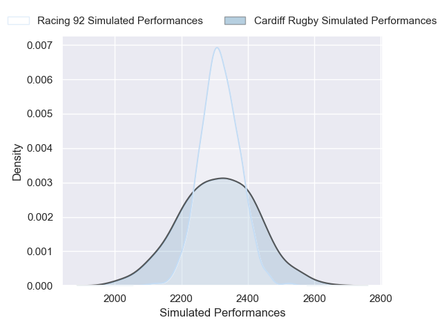 Each club has a rating and a rating deviation (similar to a Glicko rating), and expected performances can be generated. This allows for simulated matches and spreads like the ones below.