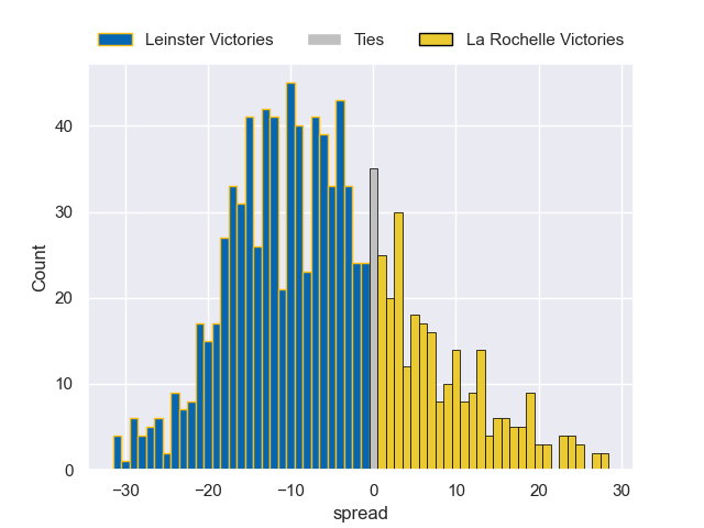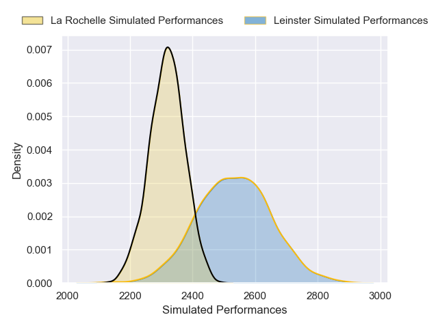 Each club has a rating and a rating deviation (similar to a Glicko rating), and expected performances can be generated. This allows for simulated matches and spreads like the ones below.