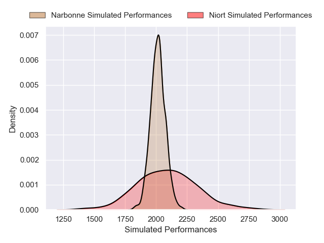 Each club has a rating and a rating deviation (similar to a Glicko rating), and expected performances can be generated. This allows for simulated matches and spreads like the ones below.