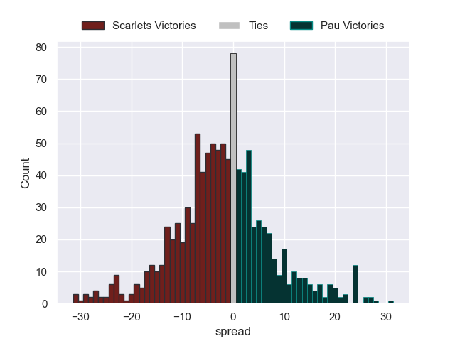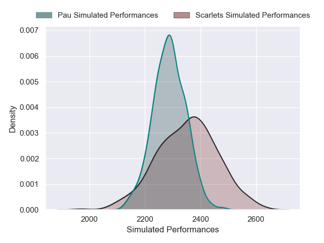 Each club has a rating and a rating deviation (similar to a Glicko rating), and expected performances can be generated. This allows for simulated matches and spreads like the ones below.