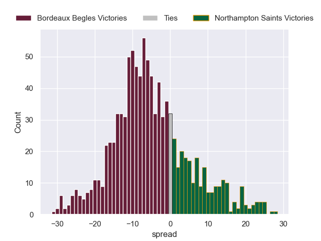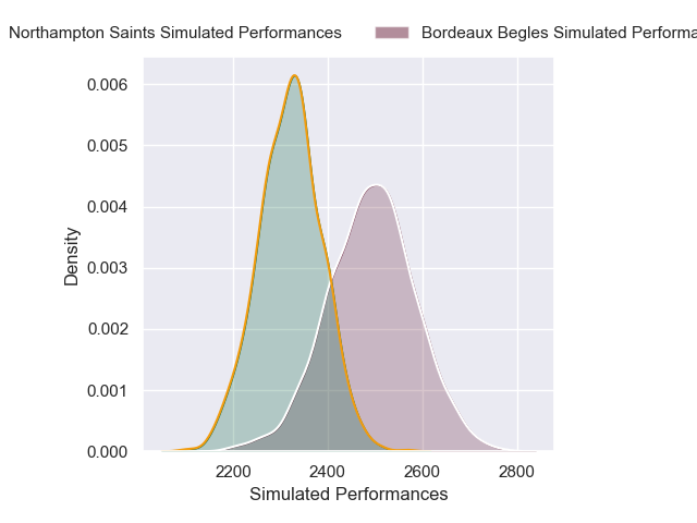 Each club has a rating and a rating deviation (similar to a Glicko rating), and expected performances can be generated. This allows for simulated matches and spreads like the ones below.