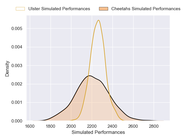 Each club has a rating and a rating deviation (similar to a Glicko rating), and expected performances can be generated. This allows for simulated matches and spreads like the ones below.
