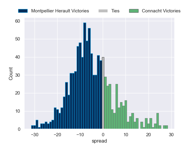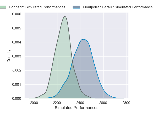 Each club has a rating and a rating deviation (similar to a Glicko rating), and expected performances can be generated. This allows for simulated matches and spreads like the ones below.