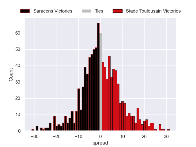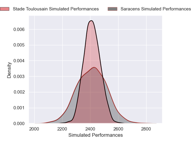 Each club has a rating and a rating deviation (similar to a Glicko rating), and expected performances can be generated. This allows for simulated matches and spreads like the ones below.