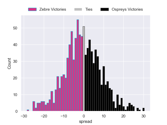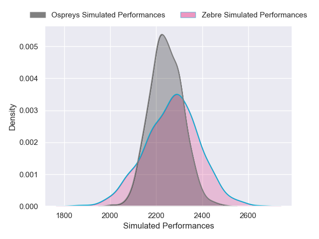 Each club has a rating and a rating deviation (similar to a Glicko rating), and expected performances can be generated. This allows for simulated matches and spreads like the ones below.