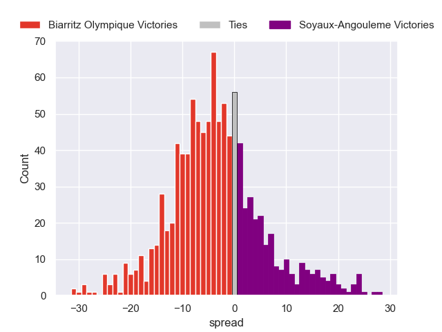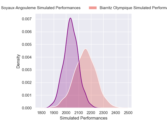 Each club has a rating and a rating deviation (similar to a Glicko rating), and expected performances can be generated. This allows for simulated matches and spreads like the ones below.