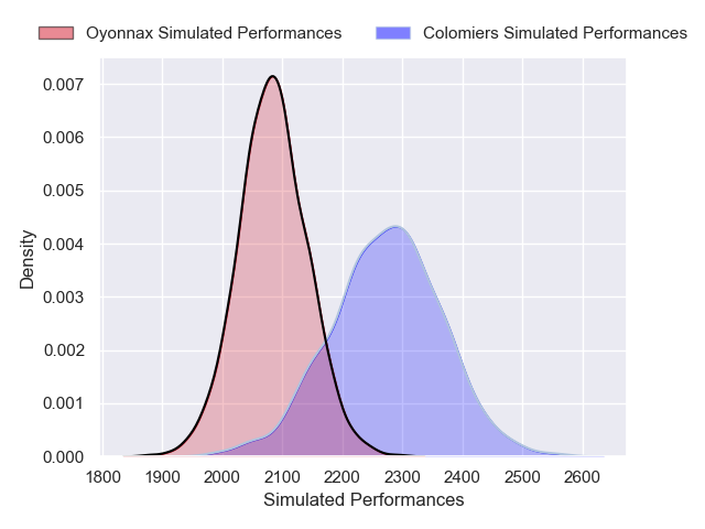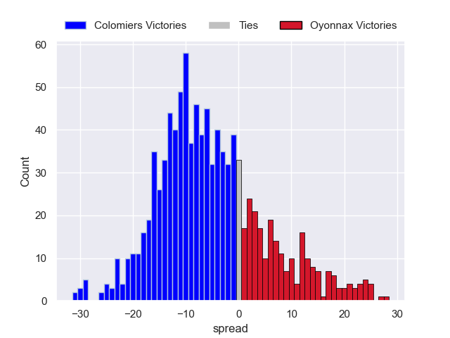 Each club has a rating and a rating deviation (similar to a Glicko rating), and expected performances can be generated. This allows for simulated matches and spreads like the ones below.