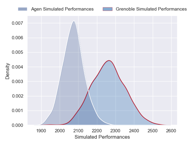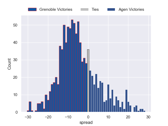 Each club has a rating and a rating deviation (similar to a Glicko rating), and expected performances can be generated. This allows for simulated matches and spreads like the ones below.