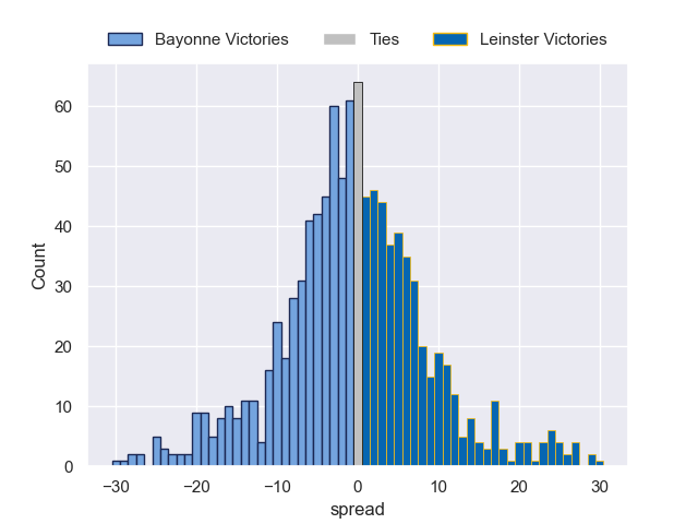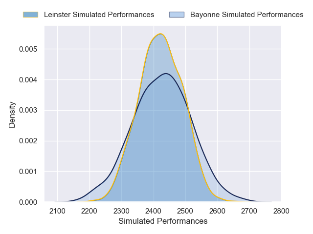 Each club has a rating and a rating deviation (similar to a Glicko rating), and expected performances can be generated. This allows for simulated matches and spreads like the ones below.