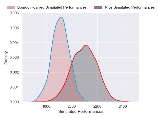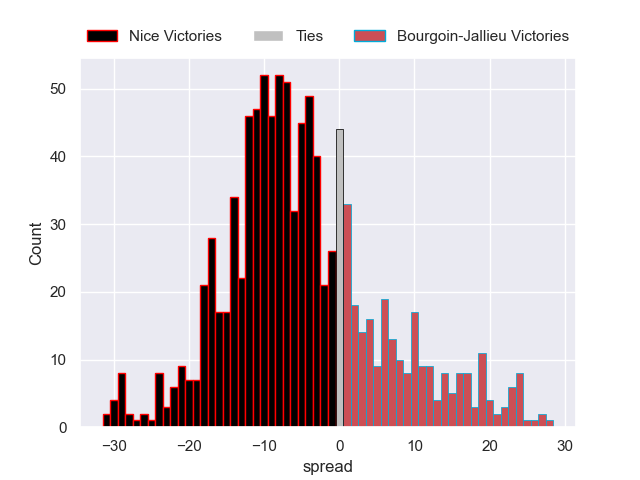 Each club has a rating and a rating deviation (similar to a Glicko rating), and expected performances can be generated. This allows for simulated matches and spreads like the ones below.