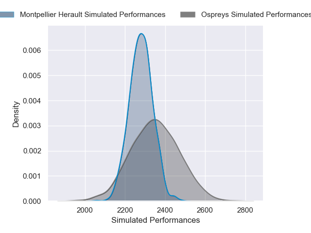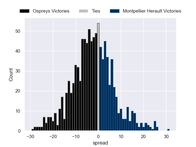 Each club has a rating and a rating deviation (similar to a Glicko rating), and expected performances can be generated. This allows for simulated matches and spreads like the ones below.