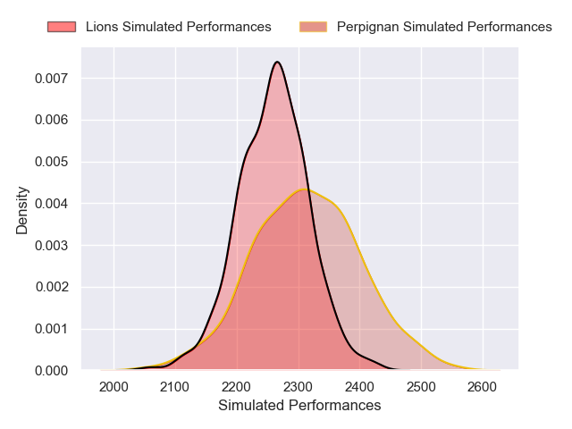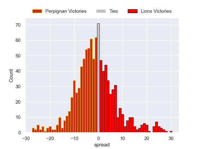 Each club has a rating and a rating deviation (similar to a Glicko rating), and expected performances can be generated. This allows for simulated matches and spreads like the ones below.