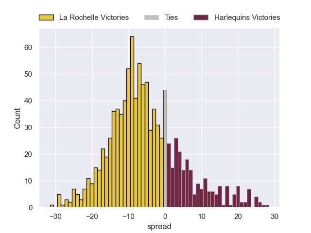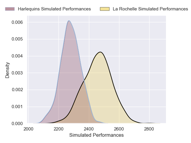 Each club has a rating and a rating deviation (similar to a Glicko rating), and expected performances can be generated. This allows for simulated matches and spreads like the ones below.