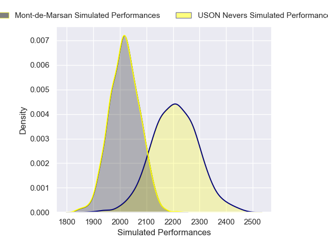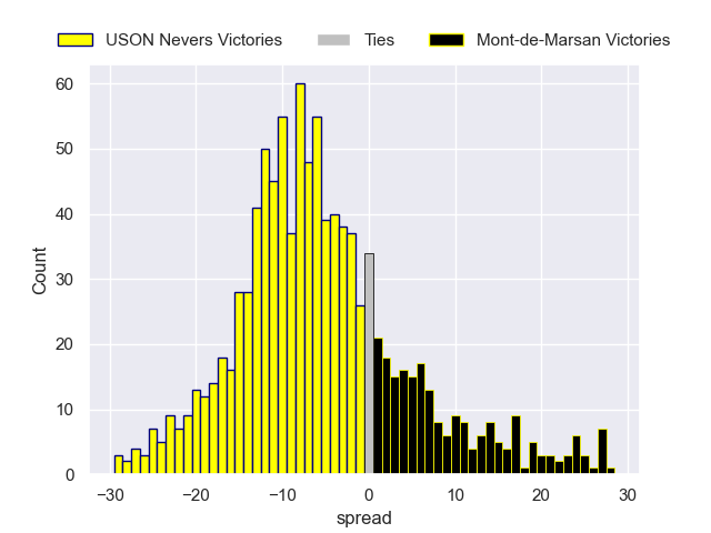 Each club has a rating and a rating deviation (similar to a Glicko rating), and expected performances can be generated. This allows for simulated matches and spreads like the ones below.