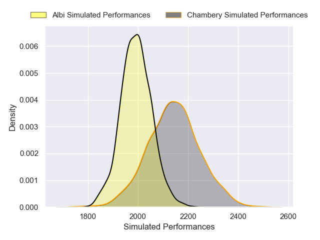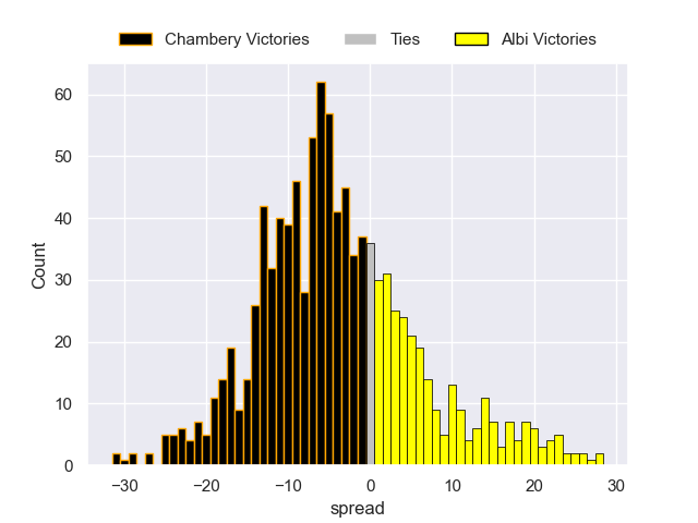 Each club has a rating and a rating deviation (similar to a Glicko rating), and expected performances can be generated. This allows for simulated matches and spreads like the ones below.