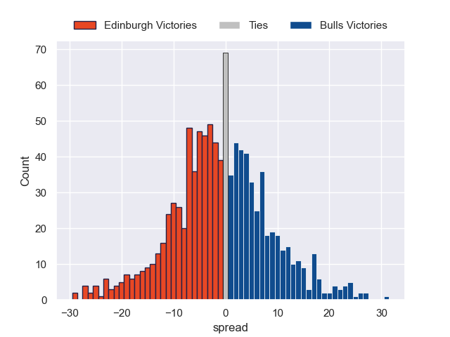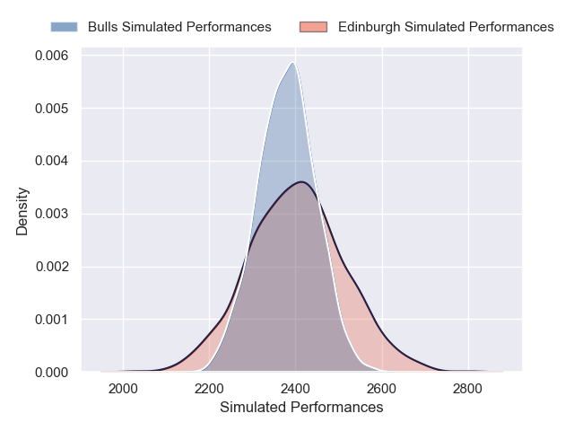 Each club has a rating and a rating deviation (similar to a Glicko rating), and expected performances can be generated. This allows for simulated matches and spreads like the ones below.