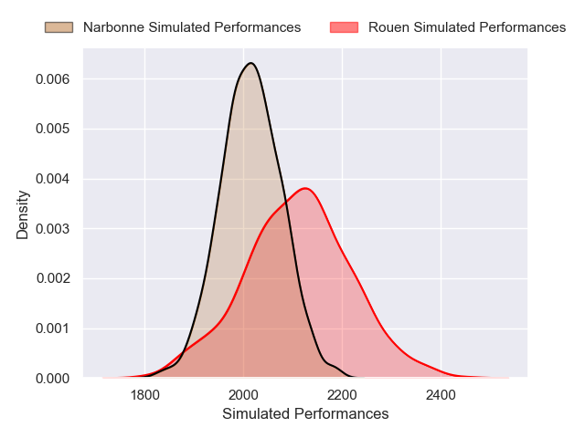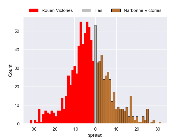 Each club has a rating and a rating deviation (similar to a Glicko rating), and expected performances can be generated. This allows for simulated matches and spreads like the ones below.