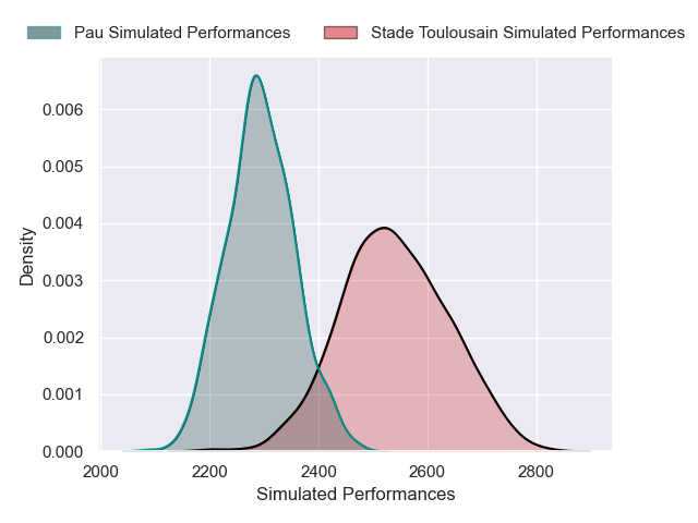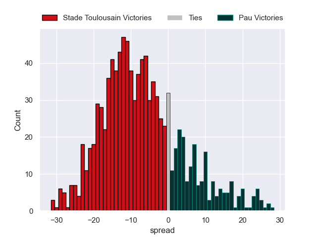 Each club has a rating and a rating deviation (similar to a Glicko rating), and expected performances can be generated. This allows for simulated matches and spreads like the ones below.