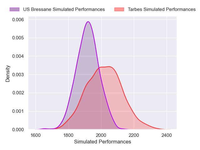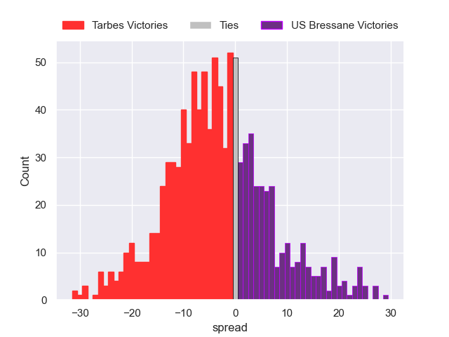 Each club has a rating and a rating deviation (similar to a Glicko rating), and expected performances can be generated. This allows for simulated matches and spreads like the ones below.