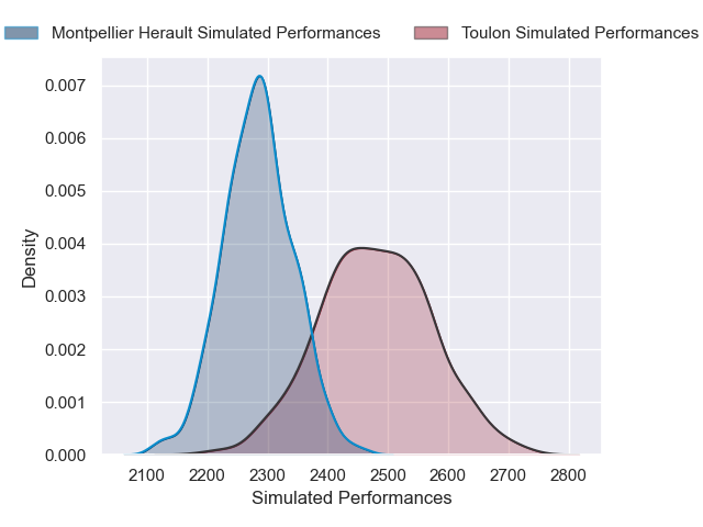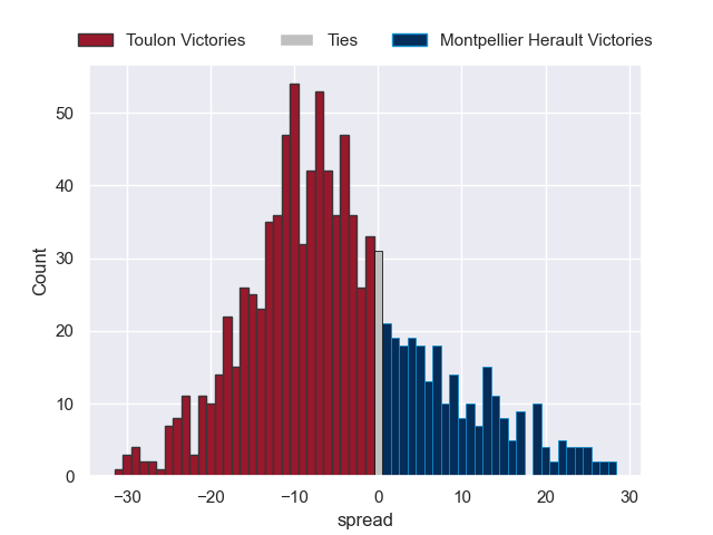 Each club has a rating and a rating deviation (similar to a Glicko rating), and expected performances can be generated. This allows for simulated matches and spreads like the ones below.