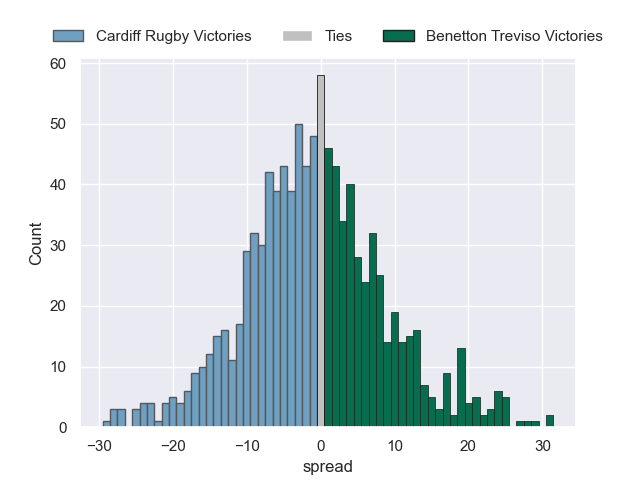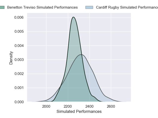 Each club has a rating and a rating deviation (similar to a Glicko rating), and expected performances can be generated. This allows for simulated matches and spreads like the ones below.