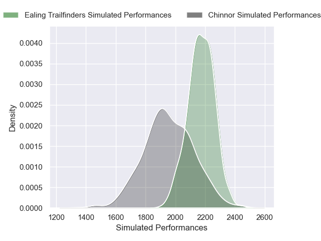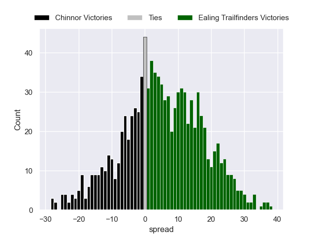 Each club has a rating and a rating deviation (similar to a Glicko rating), and expected performances can be generated. This allows for simulated matches and spreads like the ones below.