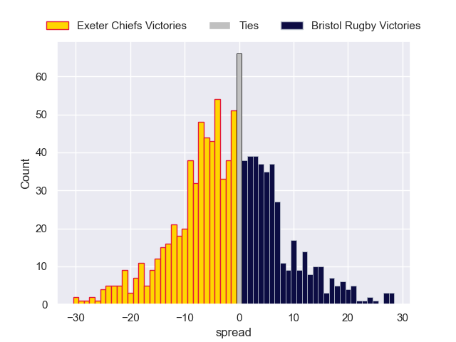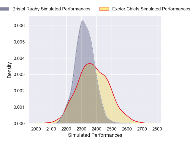Each club has a rating and a rating deviation (similar to a Glicko rating), and expected performances can be generated. This allows for simulated matches and spreads like the ones below.